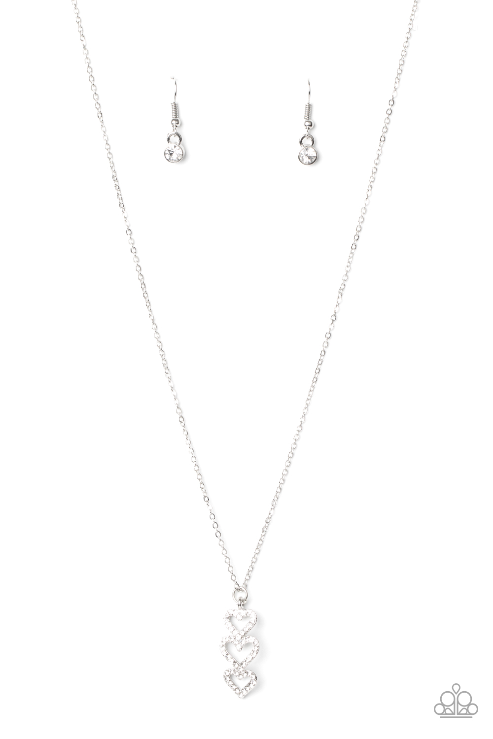 Encrusted in sparkly white rhinestones, a trio of glittery heart frames delicately stack into a charming pendant that swings from a dainty silver chain below the collar for a flirty finish. Features an adjustable clasp closure.