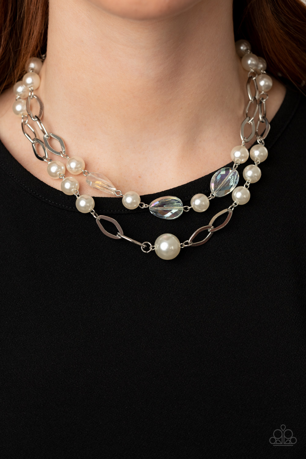 A mismatched collection of pearly white beads, shimmery silver ovals, and metallic flecked crystal-like gems link into two polished rows below the collar, creating colorfully timeless layers. Feature an adjustable clasp closure.