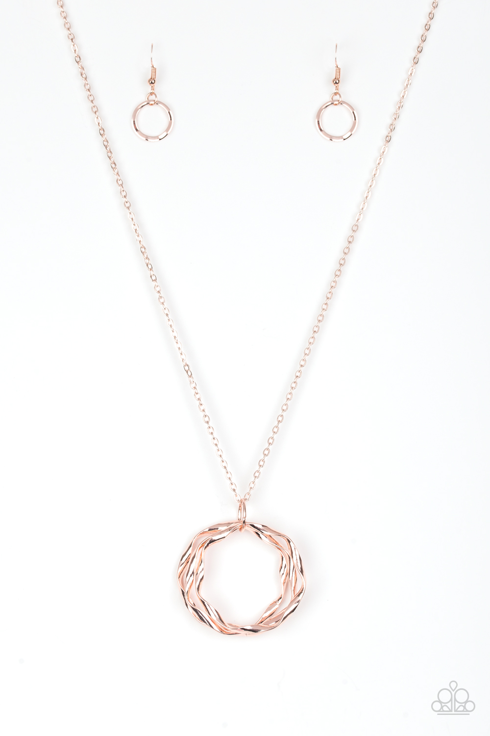 Twirling rose gold hoops swing from the bottom of an elegantly elongated rose gold chain, creating a dizzying pendant. Features an adjustable clasp closure.