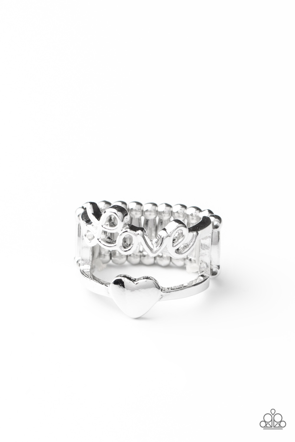 A glistening silver ribbon spells out the word, "love," atop a silver band dotted with a dainty silver heart center for a charmingly stacked look. Features a stretchy band for a flexible fit.
