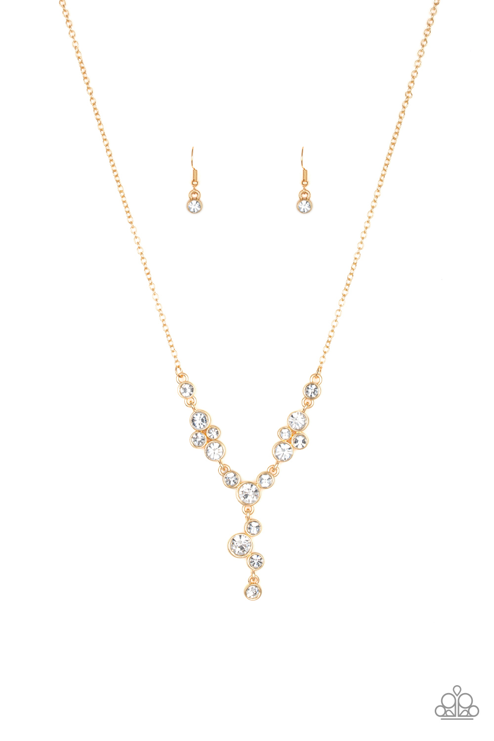 Encased in sleek gold frames, a collection of glittery white rhinestones coalesce into dazzling frames below the collar. Matching rhinestones trickle from the center, creating a glamorous extended pendant. Features an adjustable clasp closure.