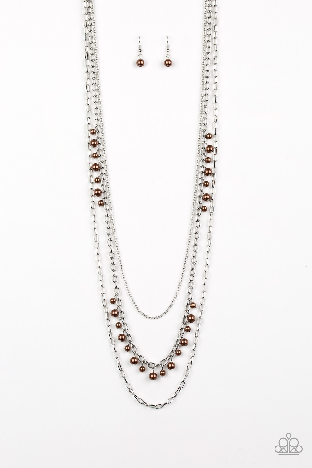 Three mismatched silver chains layer down the chest. Dainty brown pearls cascade down one silver chain, adding a flirty twist to the timeless pearl palette. Features an adjustable clasp closure.