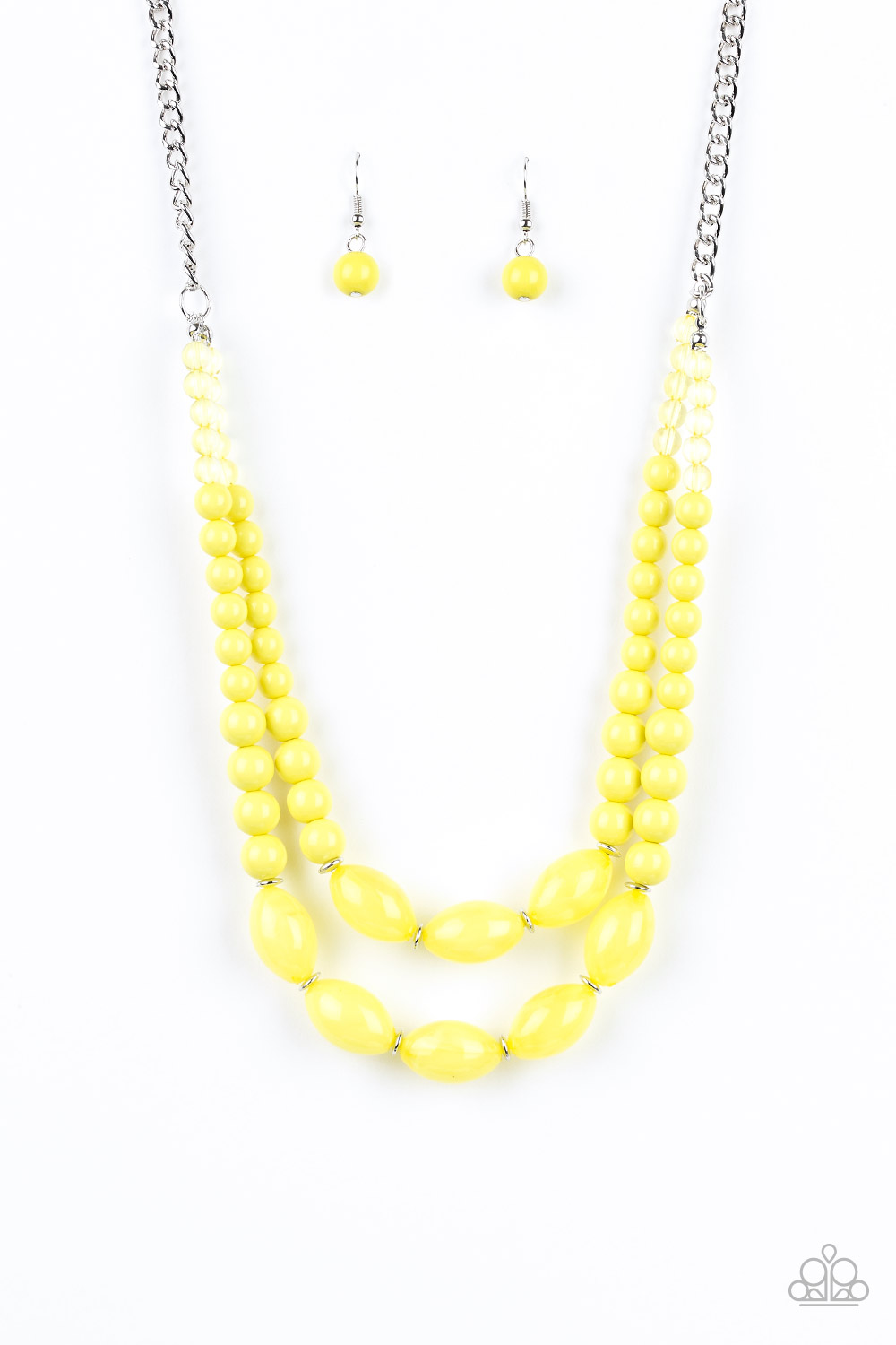 A collection of glassy, polished, and cloudy yellow beads are threaded along two invisible wires below the collar for a beautiful pop of color. Features an adjustable clasp closure.