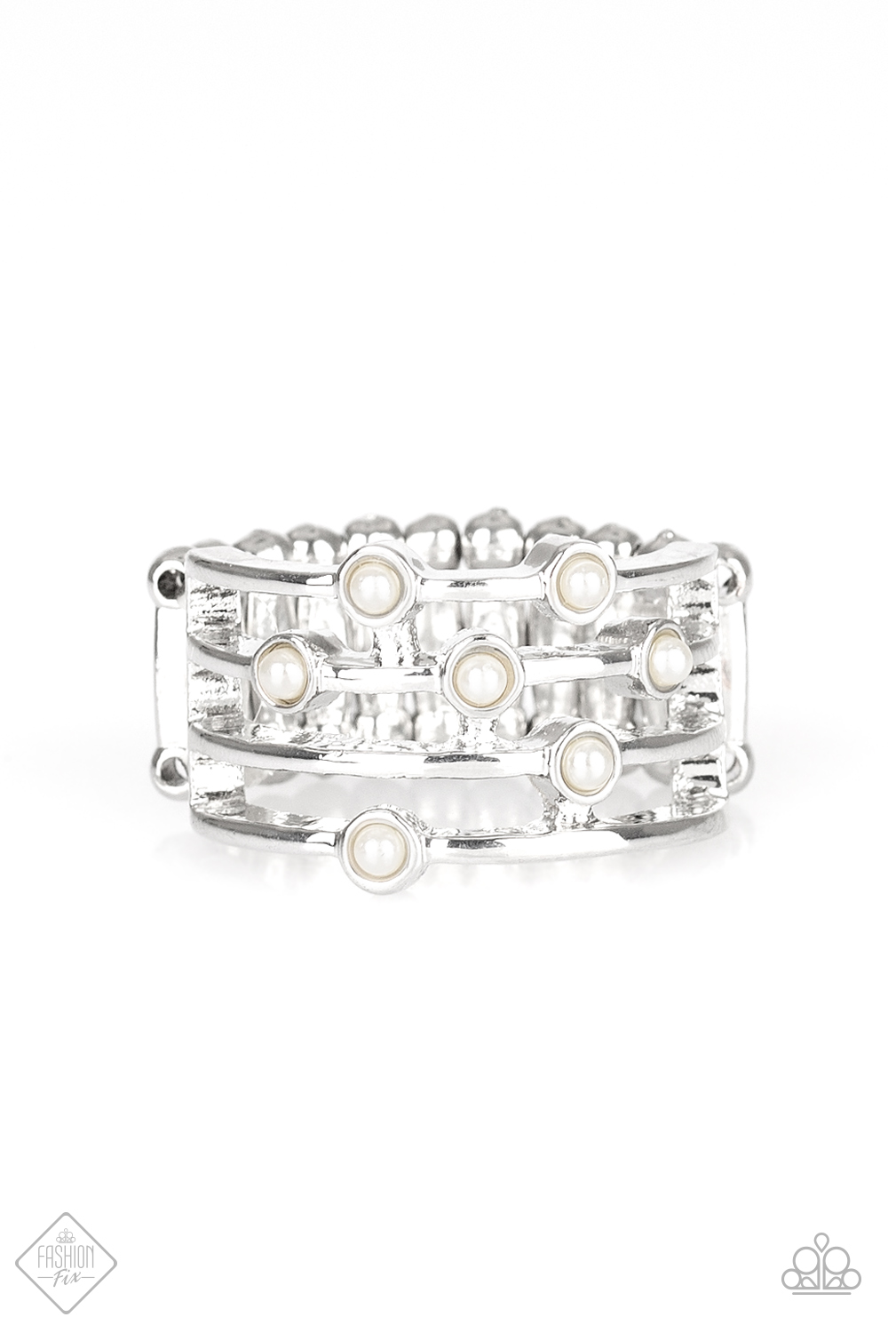 Dainty white pearls haphazardly dot the tops of dainty silver bands, adding a modern scattered look to the timelessly layered palette. Features a dainty stretchy band for a flexible fit.