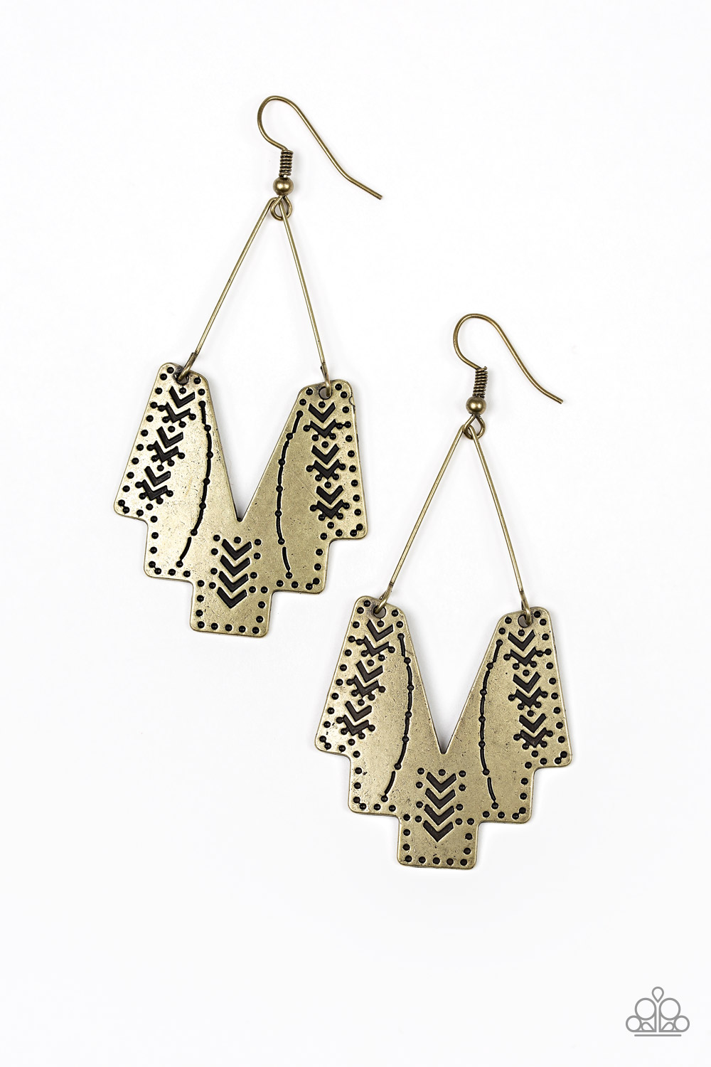 Stamped in tribal inspired patterns, an abstract geometric frame swings from a brass wire fitting for a tribal inspired look. Earrings attaches a standard fishhook fittings.