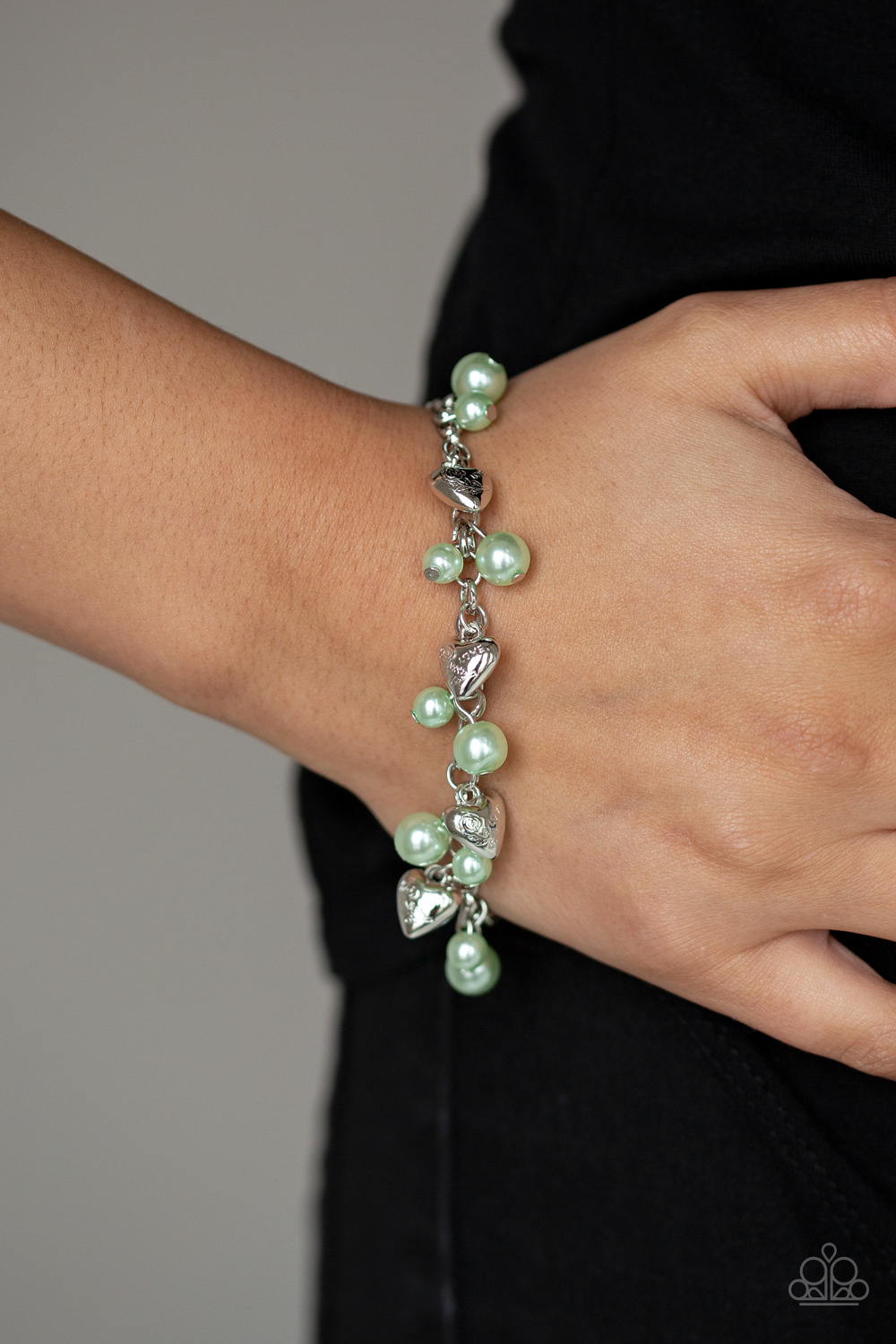 A collection of shiny silver beads and pearly green beads swing from the wrist. Stamped in the word, "Love", floral heart charms are sprinkled between the beaded fringe for a flirtatious finish. Features an adjustable clasp closure.