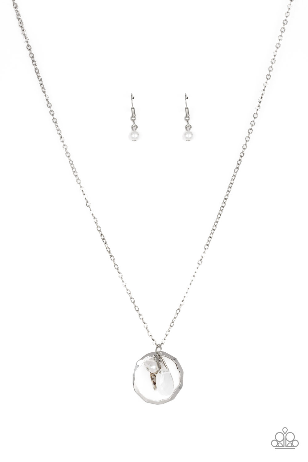A dainty shell, white crystal-like bead, opaque teardrop, and pearly white beads swing from the bottom of a hammered silver hoop, creating a whimsically clustered pendant below the collar. Features an adjustable clasp closure.