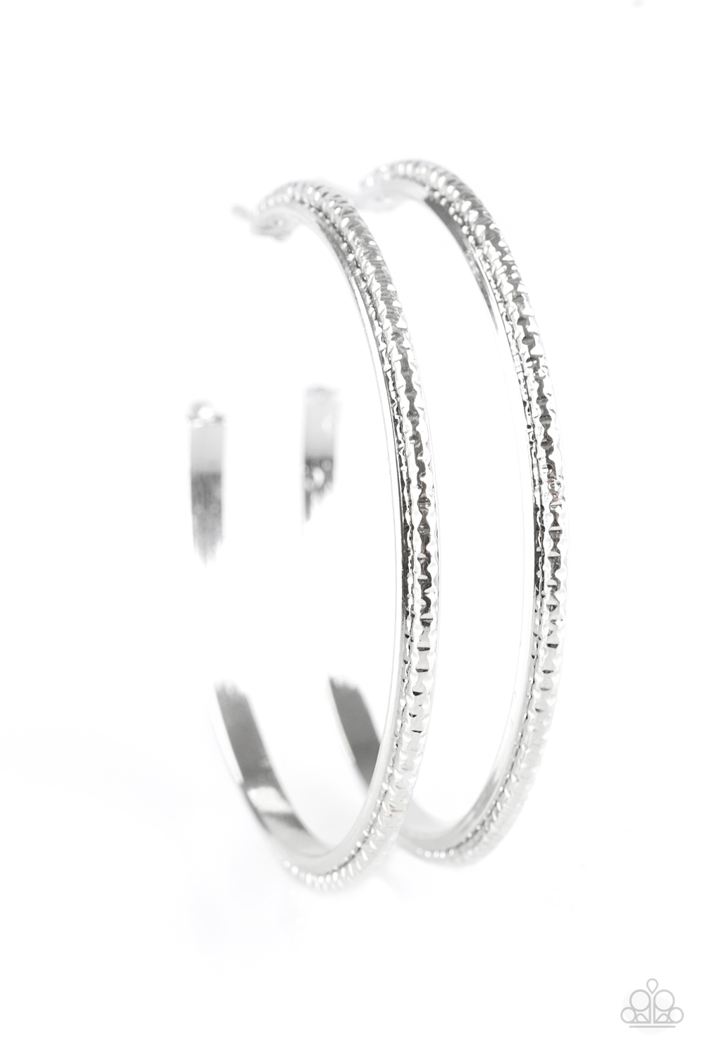 Etched in diamond cut textures, a shimmery silver hoop curls around a smooth silver frame, coalescing into an edgy hoop. Earring attaches to a standard post fitting. Hoop measures 2" in diameter.