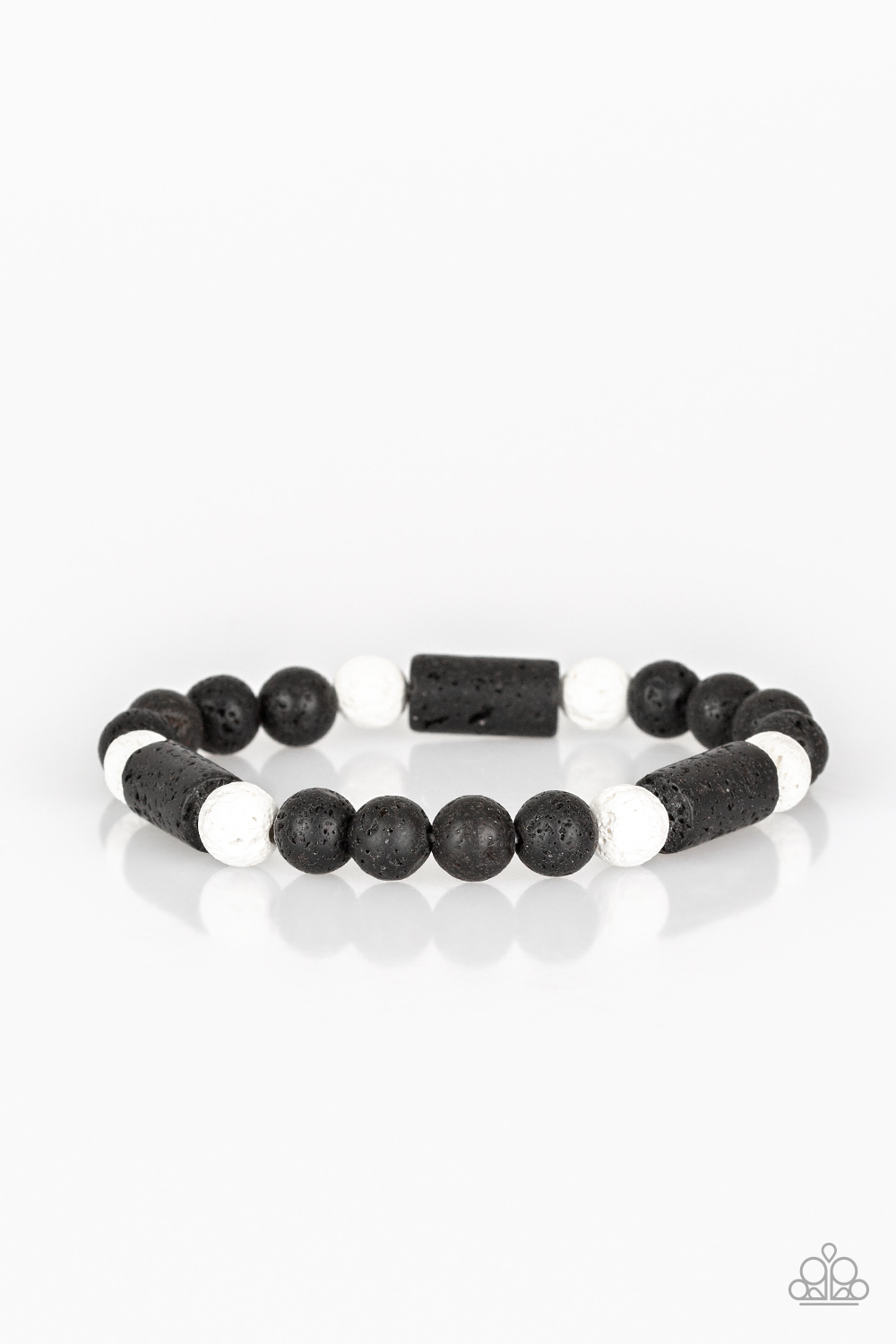 A collection of earthy black and white lava rock beads are threaded along a stretchy band around the wrist for a seasonal look.
