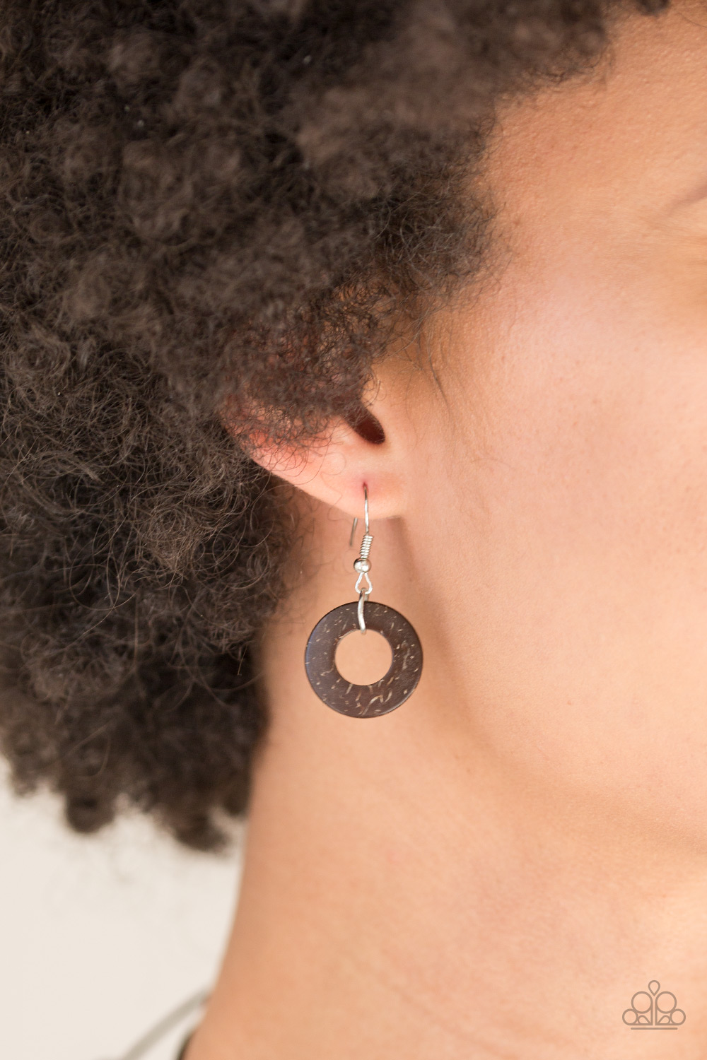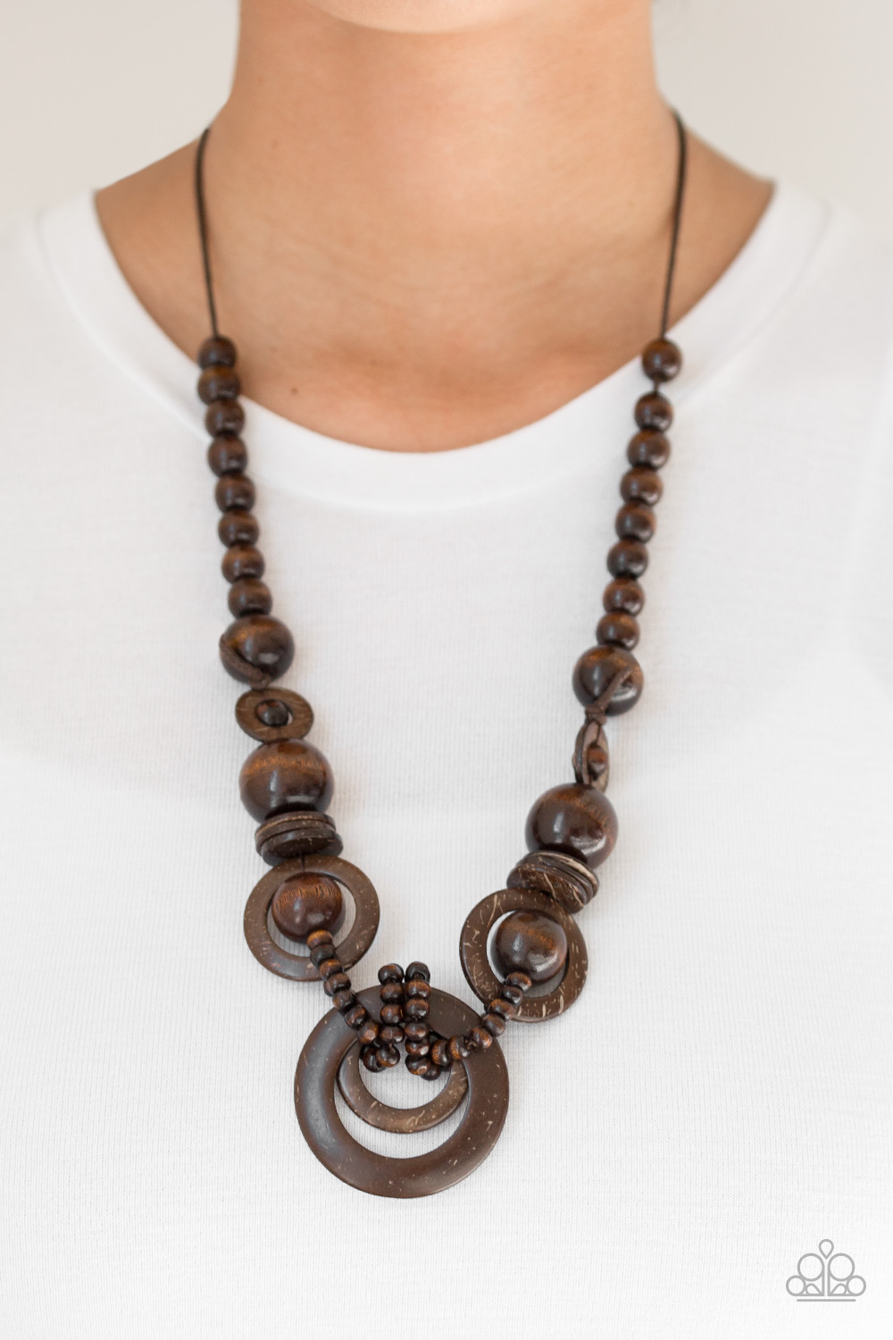 Mismatched brown wooden beads are knotted in place below the collar for a seasonal look. Features an adjustable sliding knot closure.