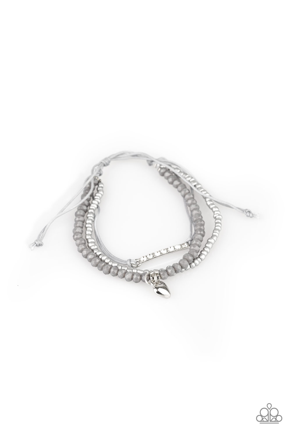Brushed in an iridescent shimmer, a row of faceted gray beads and a strand of glistening metallic seed beads layer across the wrist. Featuring a rhinestone encrusted frame, a strand of gray cording is added to the layers, while a silver heart charm swings from the wrist for a whimsical finish. Features an adjustable sliding knot closure.