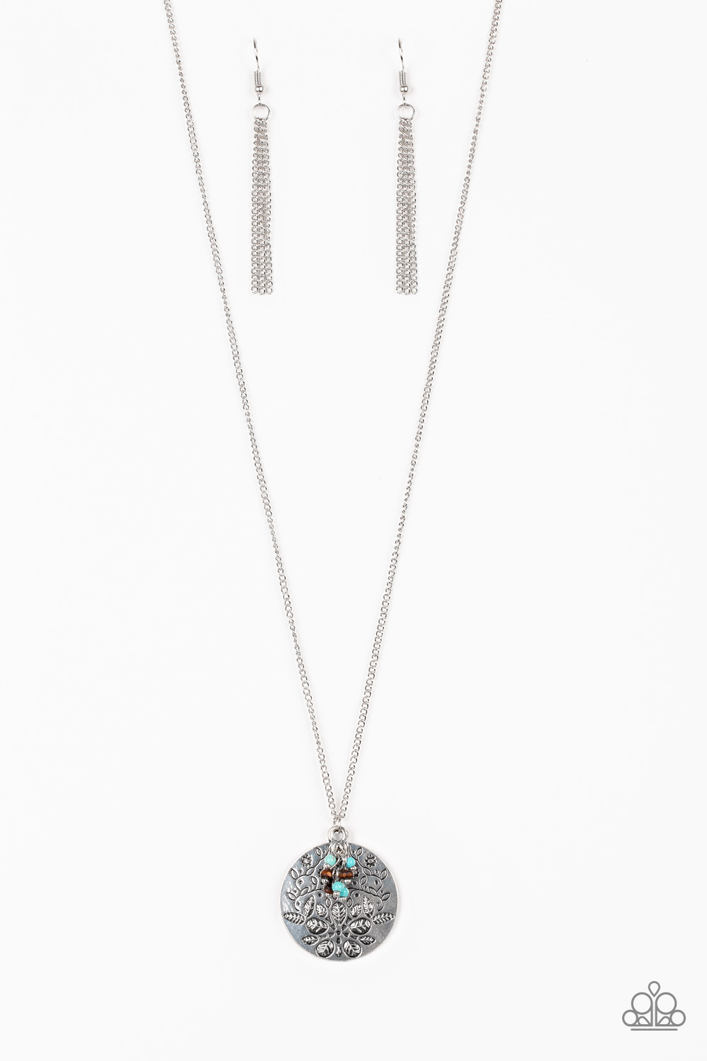 A floral embossed silver disc and dainty wooden and turquoise stone beads swing from the bottom of a lengthened silver chain for a whimsical look. Features an adjustable clasp closure.