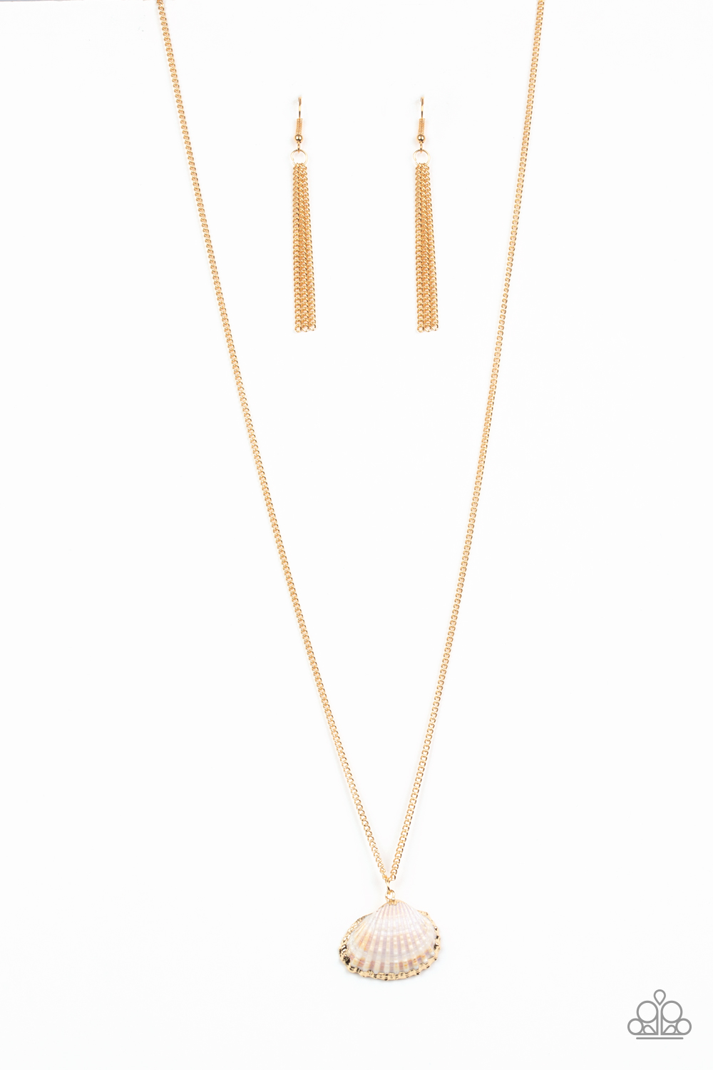 Bordered in a shimmery gold finish, a white seashell swings from the bottom of a lengthened gold chain for a summery flair. Features an adjustable clasp closure.