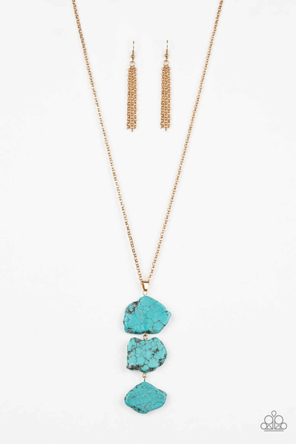 As if chipped off a cliff, pieces of turquoise rock link at the bottom of a lengthened gold chain for an earthy look. As the stone elements in this piece are natural, some color variation is normal. Features an adjustable clasp closure.