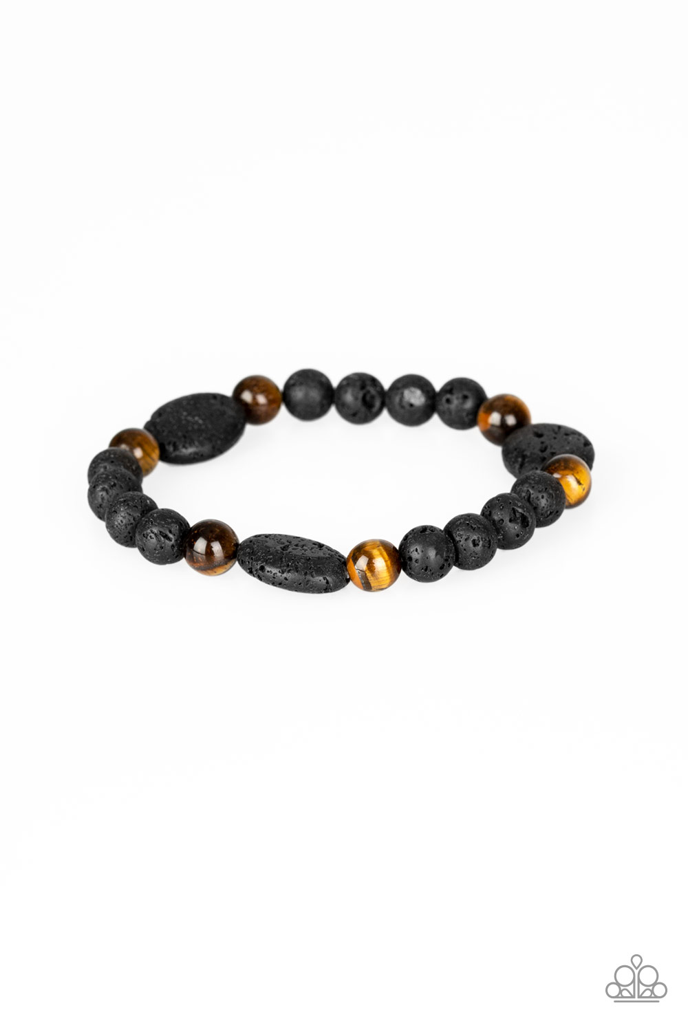 A collection of black lava rocks and earthy Tiger's Eye stone beads are threaded along a stretchy band around the wrist for a seasonal look.