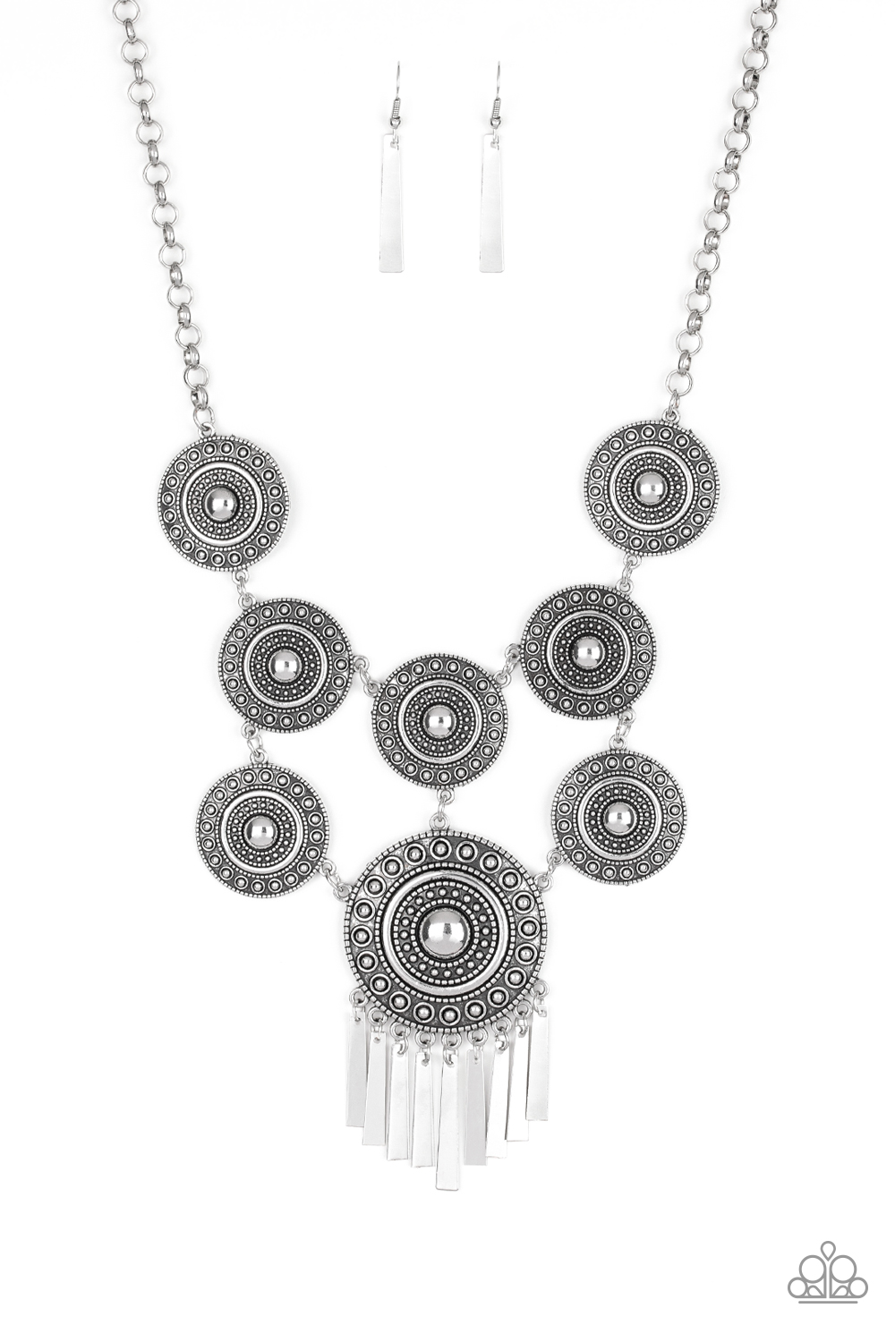 Studded in tactile circular patterns, a collection of antiqued silver disc-like frames connects into a stacked tribal pendant. A larger silver disc is suspended from the bottom, giving way to a fringe of flared silver accents for a noisemaking finish. Features an adjustable clasp closure.