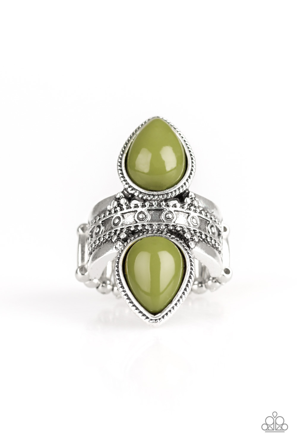 Tinted in the zesty green hue of Guacamole, polished teardrop beads flank an ornately studded silver band for a trendsetting look. Features a stretchy band for a flexible fit.