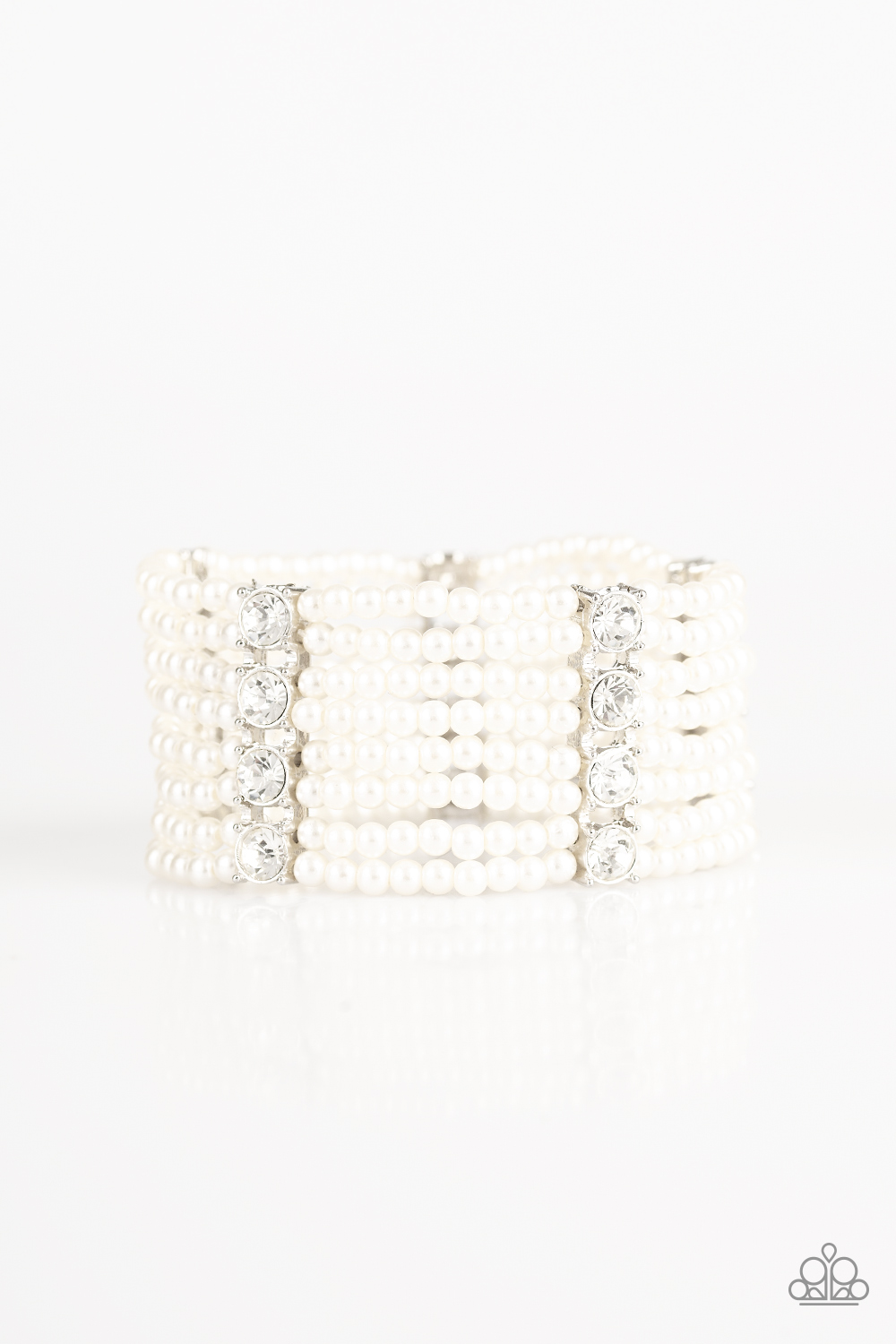 Held together by stacked white rhinestone encrusted frames, a collection of dainty white pearls are threaded along stretchy bands around the wrist for a timeless twist.