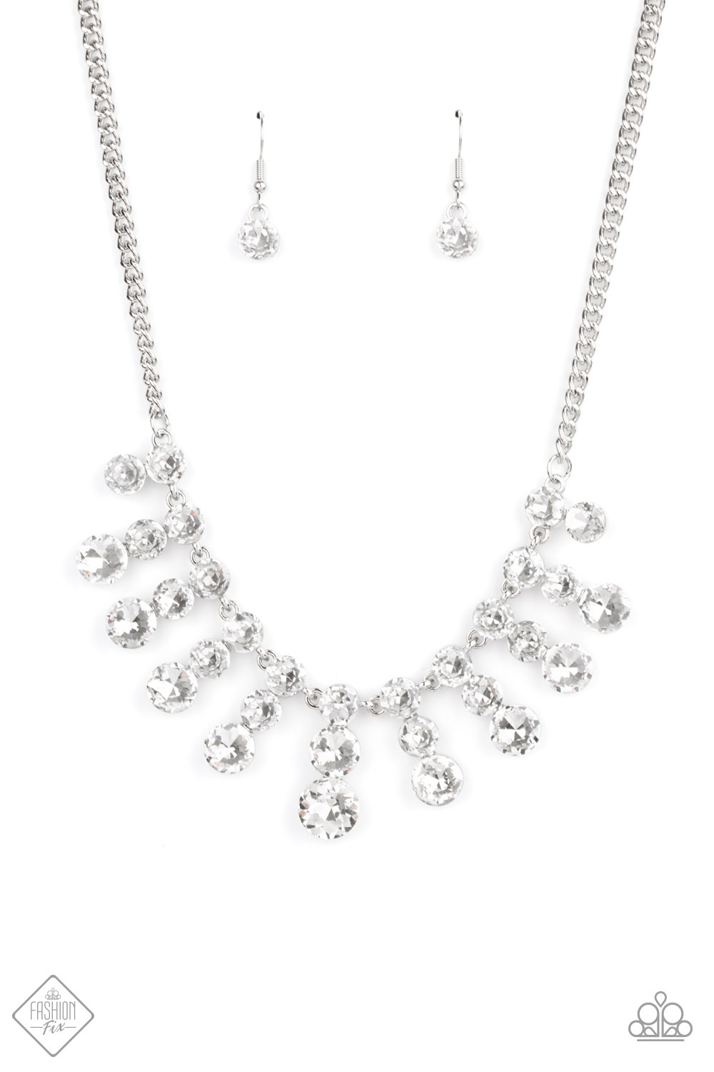 Glittery stacks of glassy white rhinestones gradually increase in size as they drip from the bottom of a classic silver chain, creating a blinding fringe that fans out below the collar. Features an adjustable clasp closure.