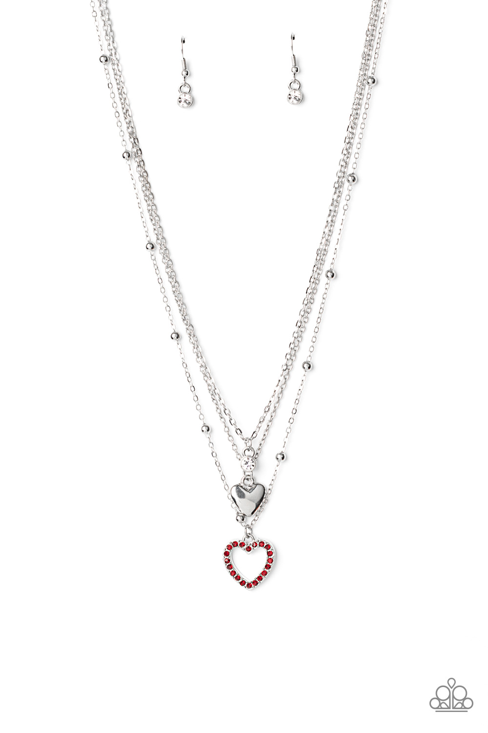A dainty white rhinestone, shiny silver heart charm, and a red rhinestone encrusted heart frame swing from the bottom of mismatched dainty silver chains, creating flirtatious layers below the collar. Features an adjustable clasp closure.