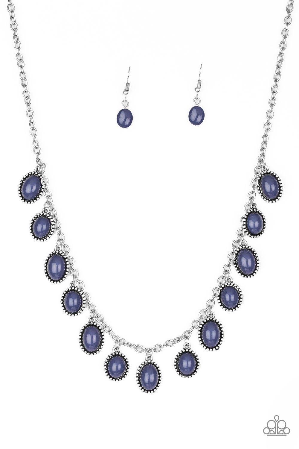 Infused with studded silver frames, round and oval Sargasso Sea beads swing from a shimmery silver chain, creating a refreshing fringe below the collar. Features an adjustable clasp closure.
