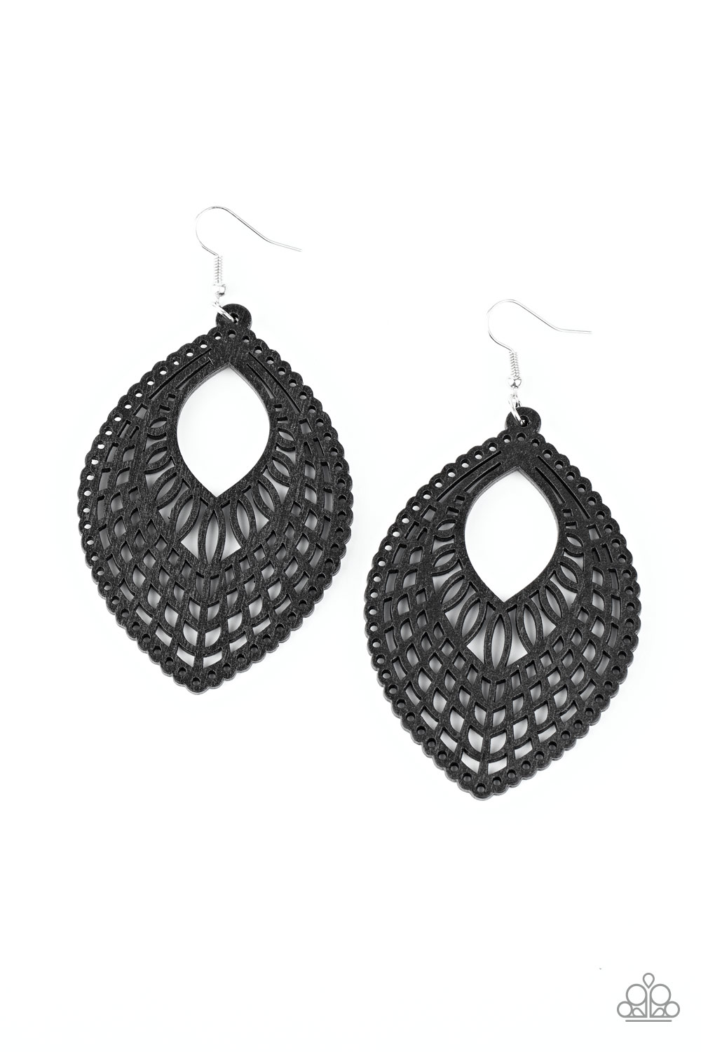 Stenciled in an airy cutout pattern, a teardrop black wooden frame swings from the ear for a seasonal look. Earring attaches to a standard fishhook fitting.
