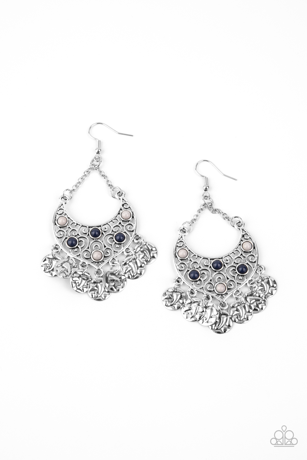 Dotted with dainty Blue Depths and Sleet beads, a shimmery backdrop of vine-like filigree coalesces into an airy frame. Suspended by two dainty silver chains, the whimsical frame gives way to a fringe of hammered silver discs for a musical finish. Earring attaches to a standard fishhook fitting.