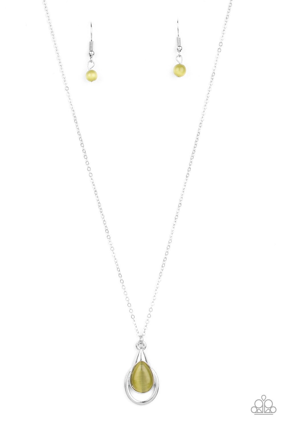 Chiseled into a tranquil teardrop, a glowing green moonstone is pressed into an abstract silver frame, creating a whimsical pendant. Features an adjustable clasp closure.
