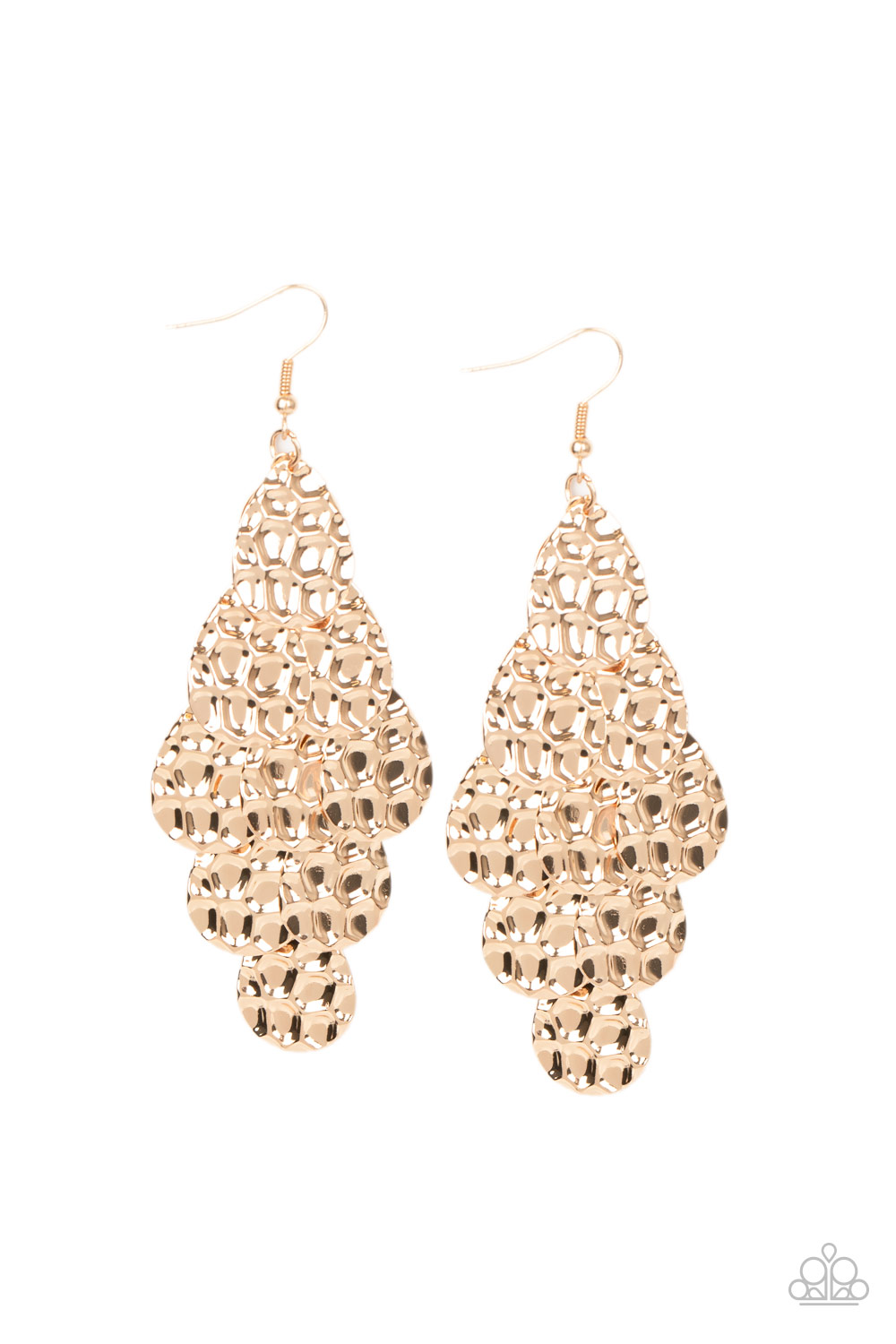 Featuring metallic honeycomb-like patterns, glistening gold teardrop frames cascade from the ear, coalescing into a noise-making lure. Earring attaches to a standard fishhook fitting.