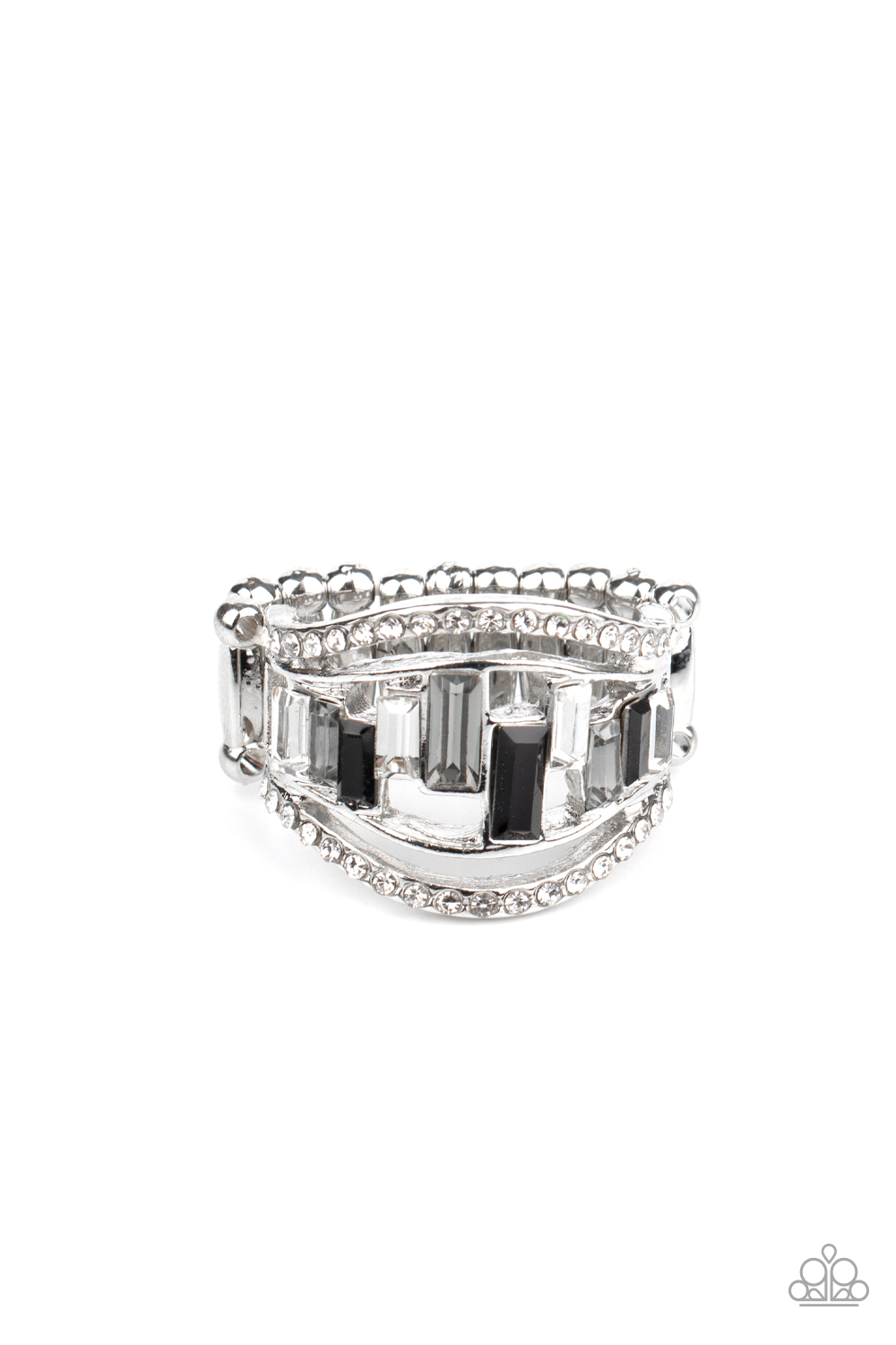 White rhinestone encrusted bands flank a row of emerald cut glass beads in shades of black, gray, and white for a regal look. Features a stretchy band for a flexible fit.