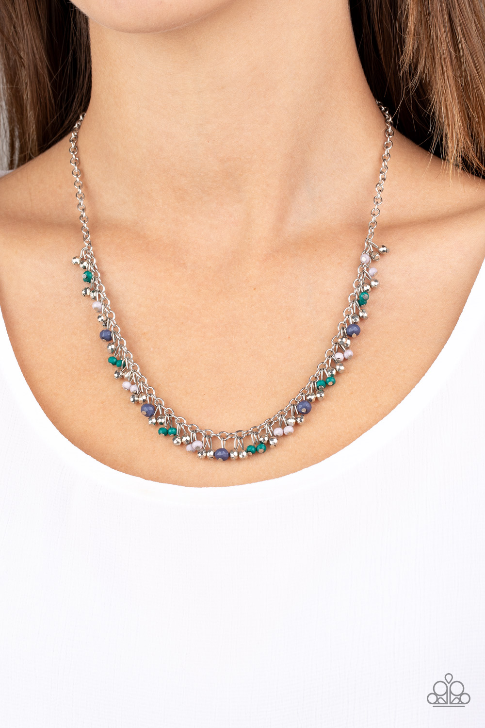 A variety of faceted Arcadia, Sailor Blue, and Harbor Mist beads swing from a shimmery silver chain, creating a flirtatious fringe below the collar. Faceted silver beads trickle between the colorful beads, adding a hint of shimmer to the seasonal design. Features an adjustable clasp closure.