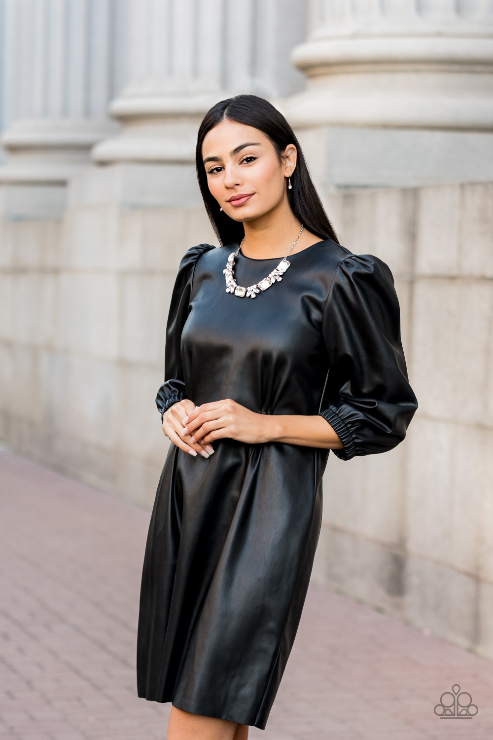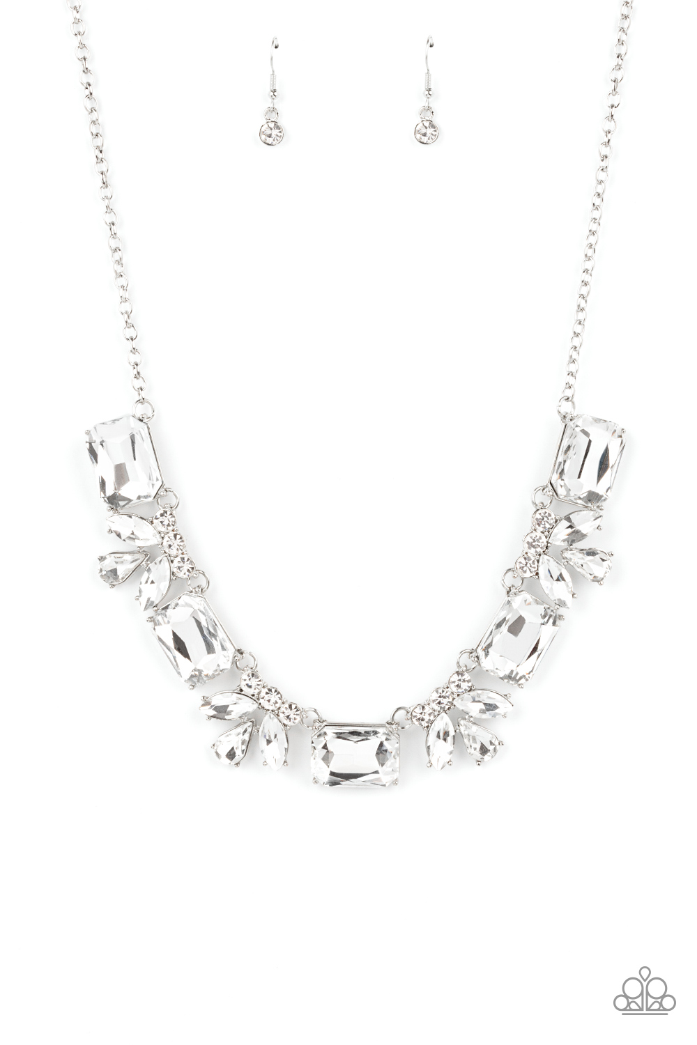 An oversized collection of white emerald cut gems and regally cut clusters of rhinestones delicately link below the collar, creating a dramatically sparkly fringe. Features an adjustable clasp closure.