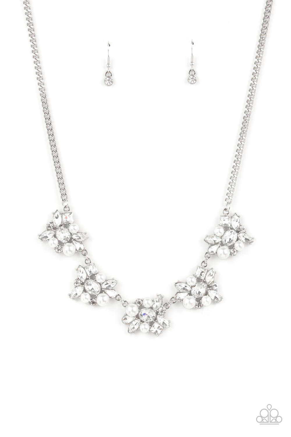 Bubbly white pearls and regally cut white rhinestones coalesce into blinding frames that glamorously link below the collar, creating a timeless fringe. Features an adjustable clasp closure.