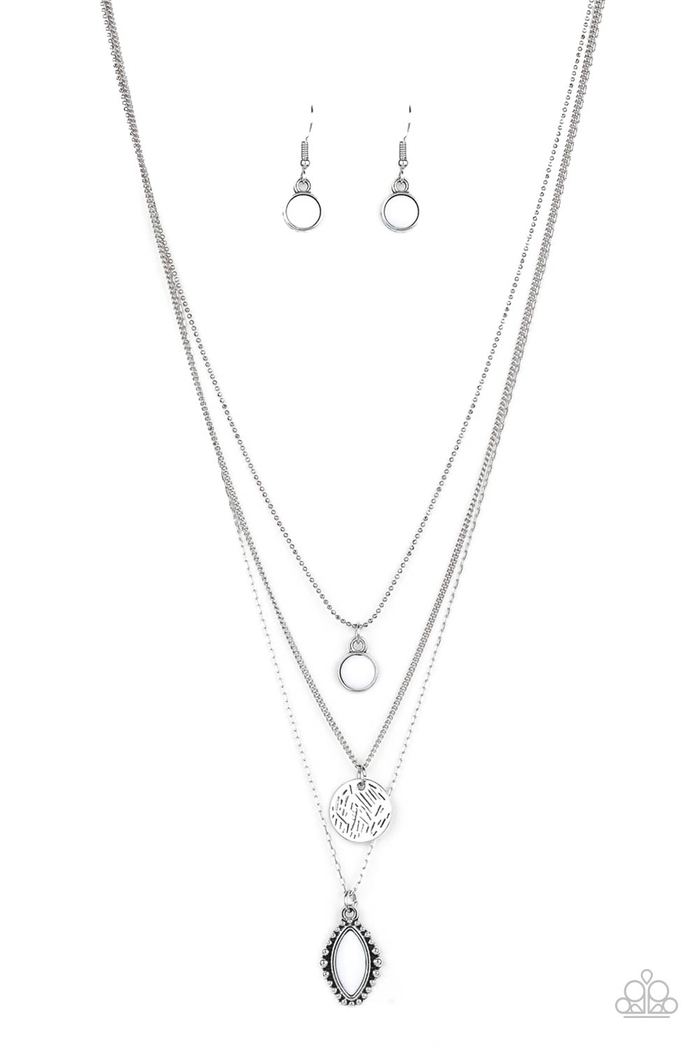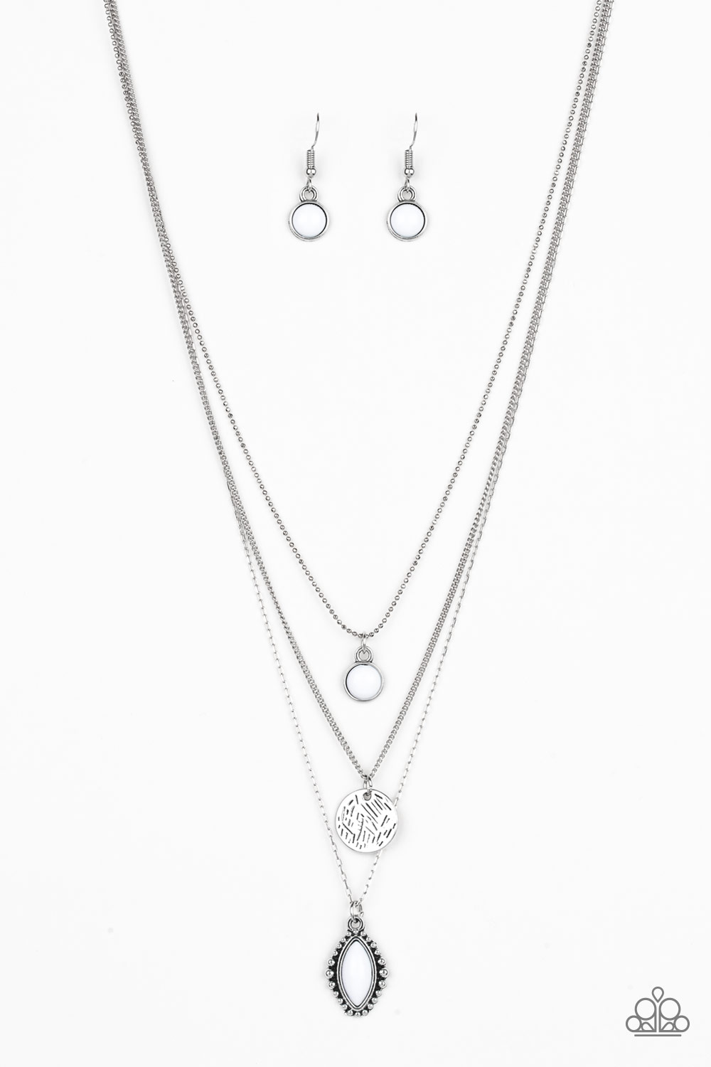 Three mismatched silver chains layer below the collar. A round white bead swings from the uppermost chain, above a scratched silver disc, and marquise-shaped white bead for a colorfully layered look. Features an adjustable clasp closure.