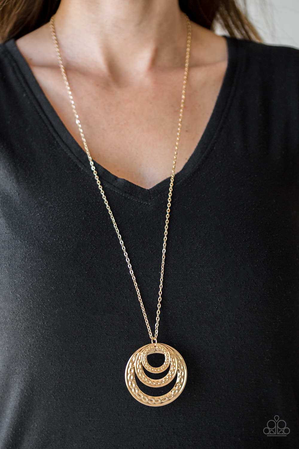 Embossed in swirling tribal detail, gold frames swing from the bottom of an elongated gold chain, creating an airy stacked pendant. Features an adjustable clasp closure.