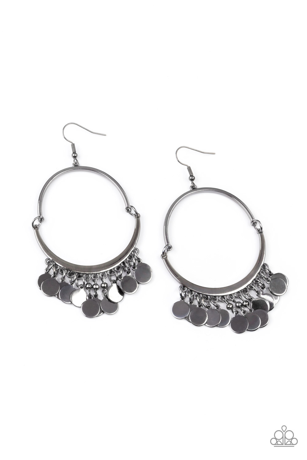 Shimmery gunmetal discs dance along the bottom of two gunmetal frames that delicately link into an airy hoop, creating a playful metallic fringe. Earring attaches to a standard fishhook fitting.