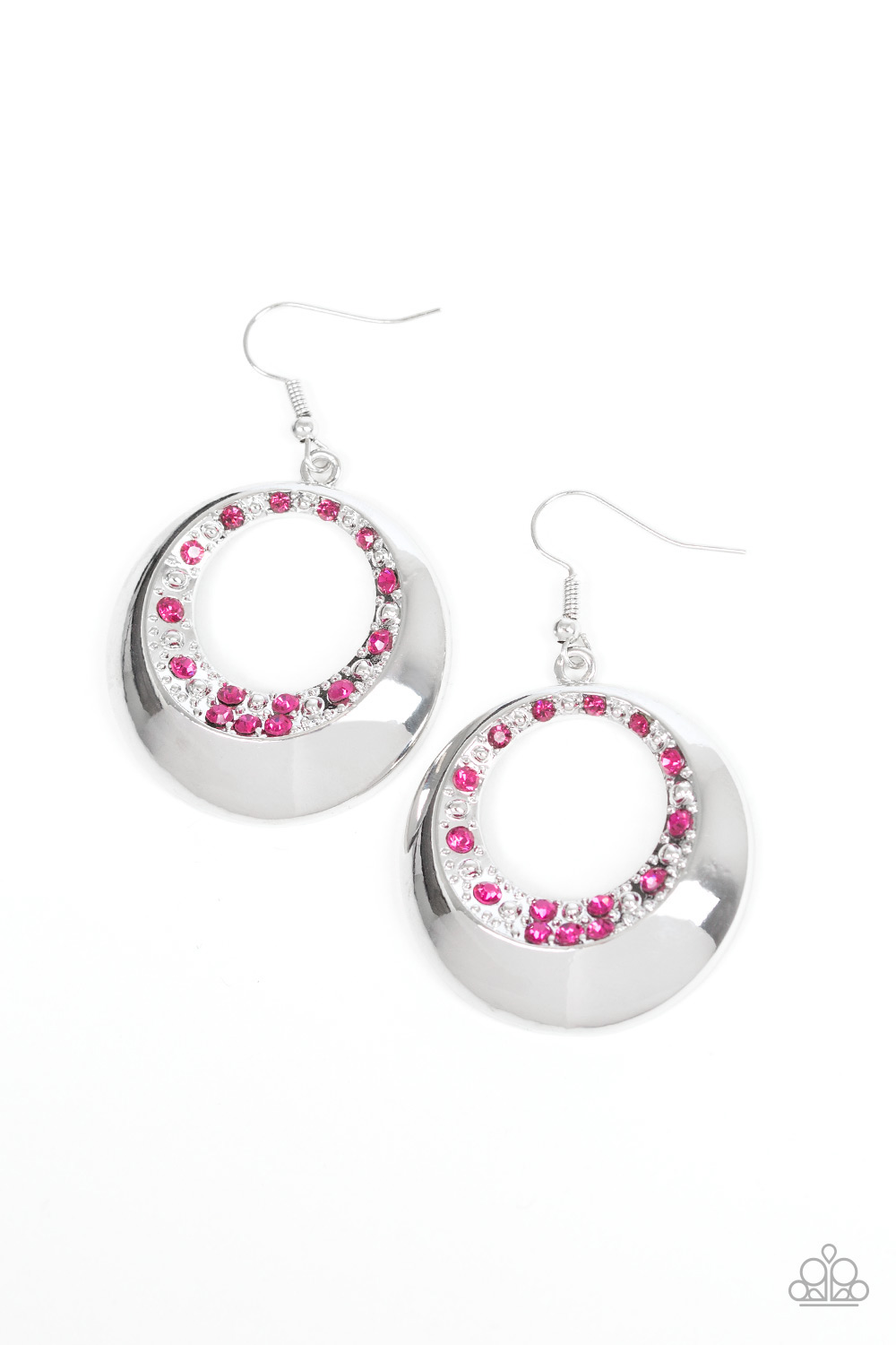 The inside of a shiny silver hoop is dotted in silver studs and glittery pink rhinestones for a refined look. Earring attaches to a standard fishhook fitting.