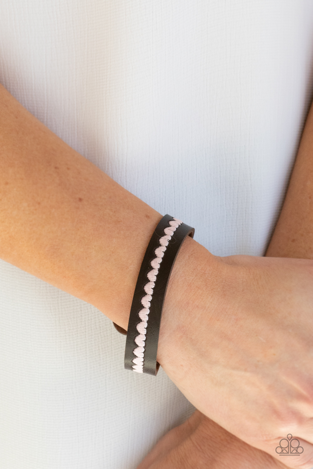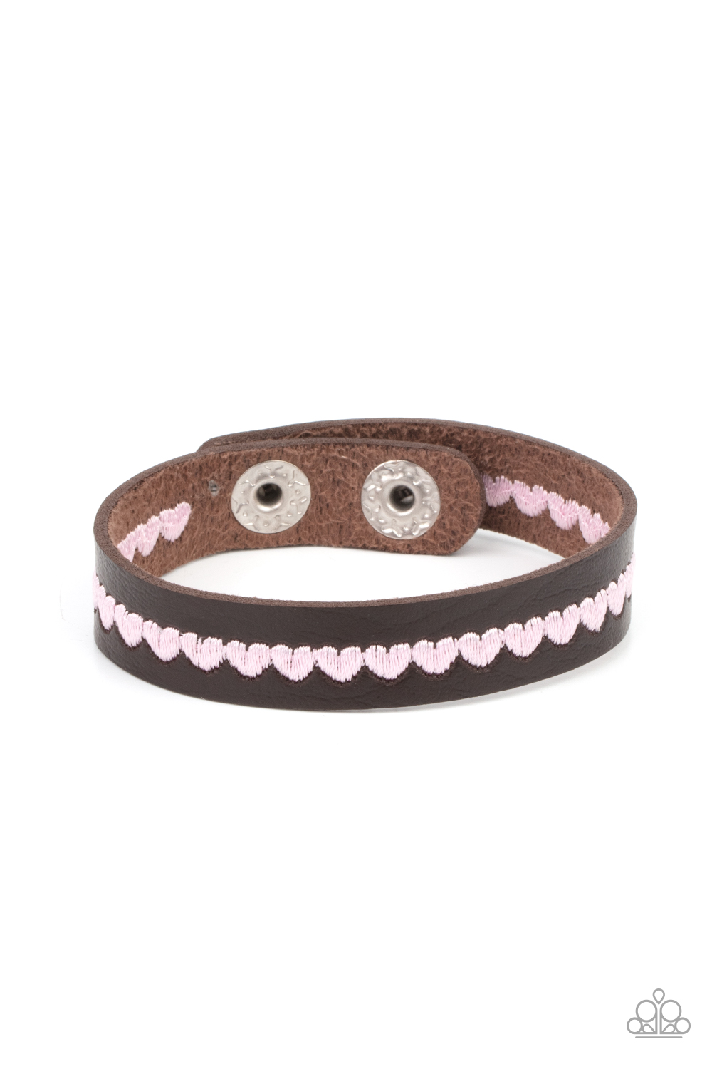 A colorful row of pink hearts is stitched across the front of a dainty brown leather band. Features an adjustable snap closure.
