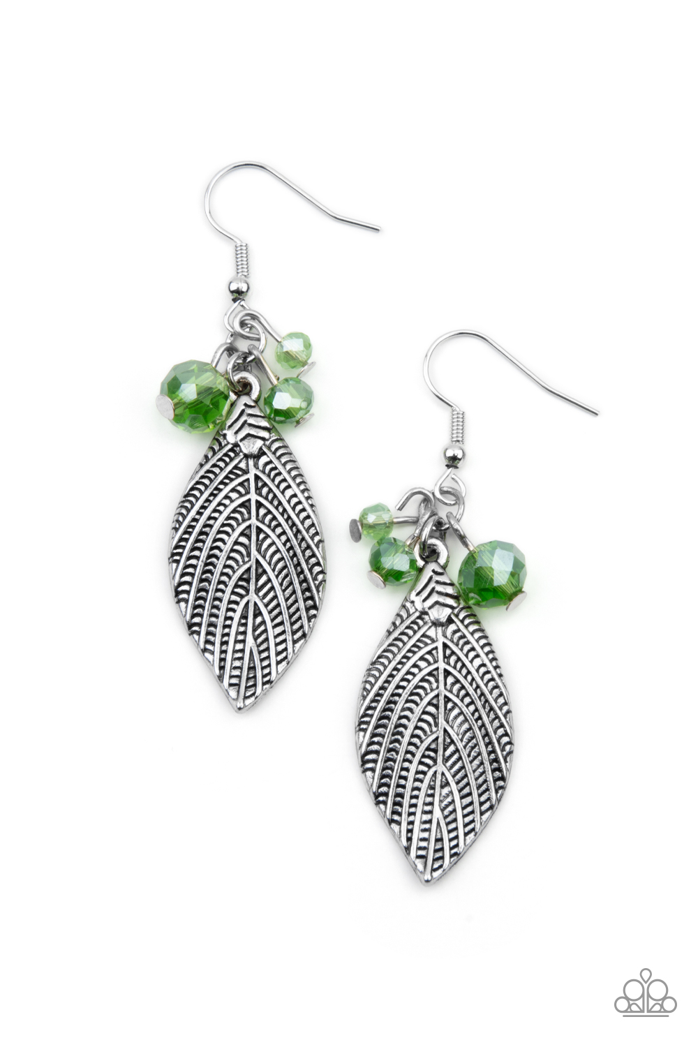 A lifelike silver leaf swings from a cluster of glittery green crystal-like beads, creating a spring inspired lure. Earring attaches to a standard fishhook fitting.