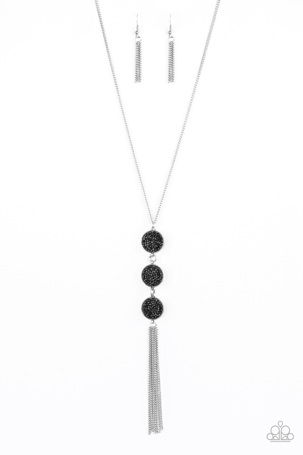 Sprinkled in glittery black prism style rhinestones, three sparkling silver frames trickle down the chest. A shimmery silver tassel swings from the bottom of the triple stacked pendant for a glamorous finish. Features an adjustable clasp closure.