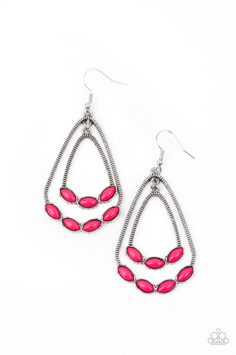 The bottoms of textured silver teardrop frames embellished in polished pink beads, creating vivaciously layered frames. Earring attaches to a standard fishhook fitting.
