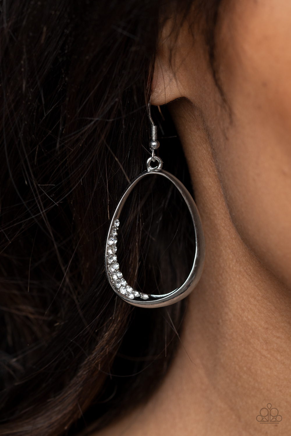 Rows of glassy white rhinestones delicately peek out from the inside corner of an asymmetrical teardrop frame, creating an unexpectedly sparkly centerpiece. Earring attaches to a standard fishhook fitting.