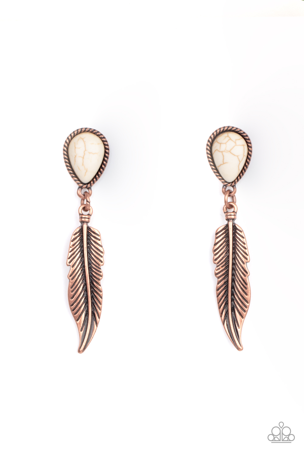 A lifelike copper feather charm swings from the bottom of a white stone teardrop, coalescing into a tranquil lure. Earring attaches to a standard post fitting.