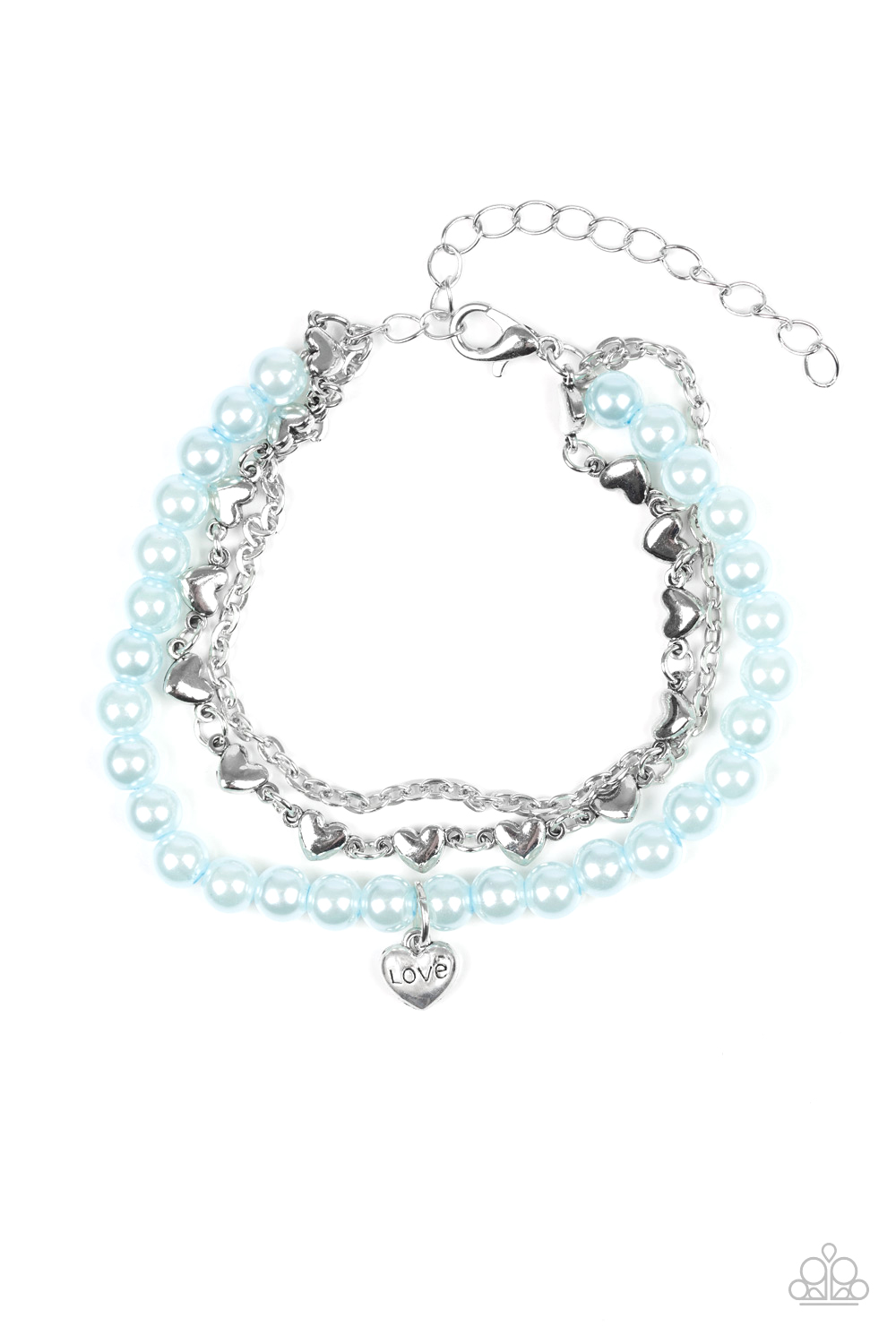 A strand of pearly blue beads, shimmery silver chains, and a row of glistening silver hearts layer around the wrist. A dainty silver heart stamped with the word, "love" swings from the beaded strand for a romantic finish. Features an adjustable clasp closure.