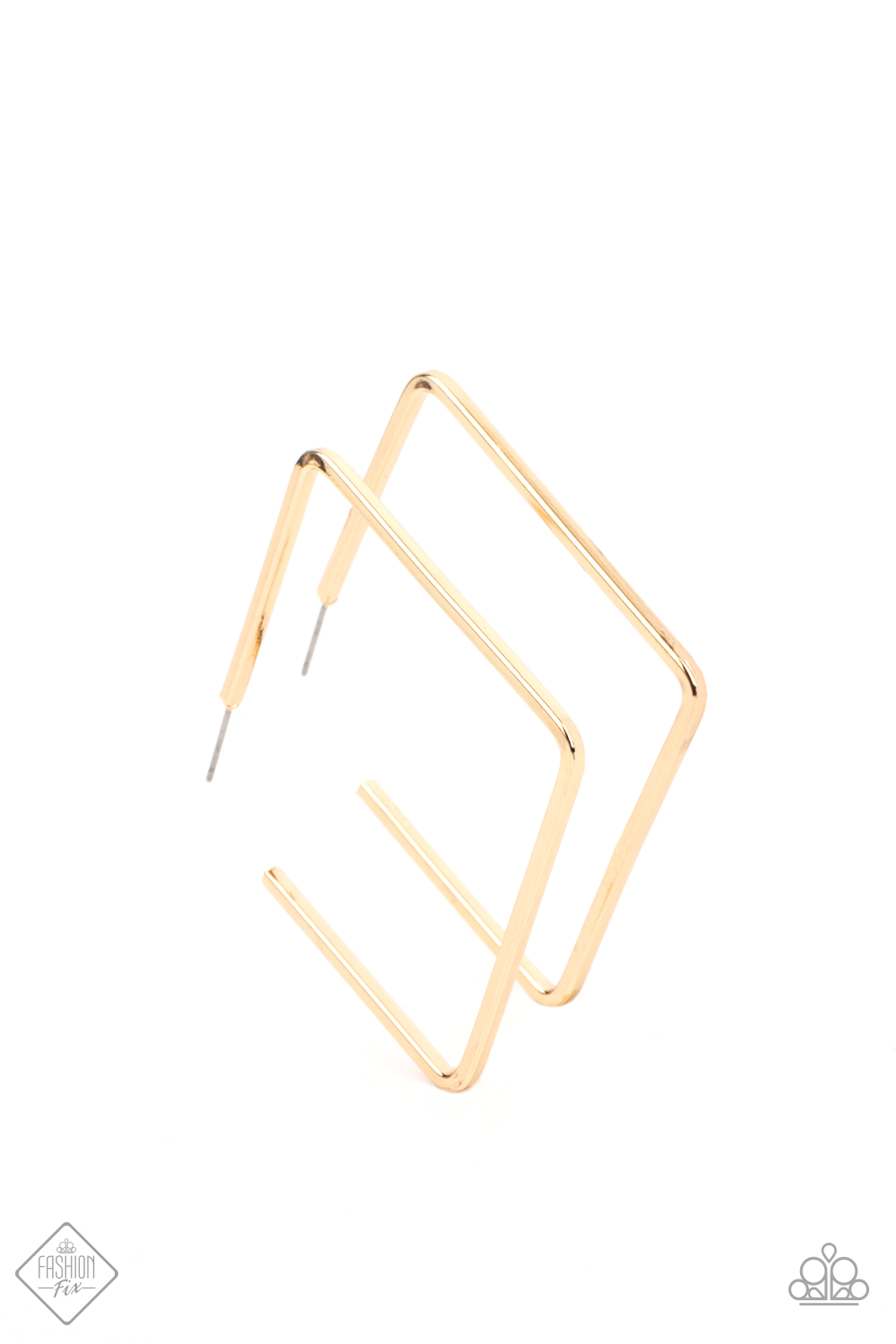 A deceptively simple square frame is tilted on point to create a geometric hoop. Its sharp angles are complemented by its rich gold finish, making a lasting impression. Earring attaches to a standard post fitting. Hoop measures approximately 2" in diameter.