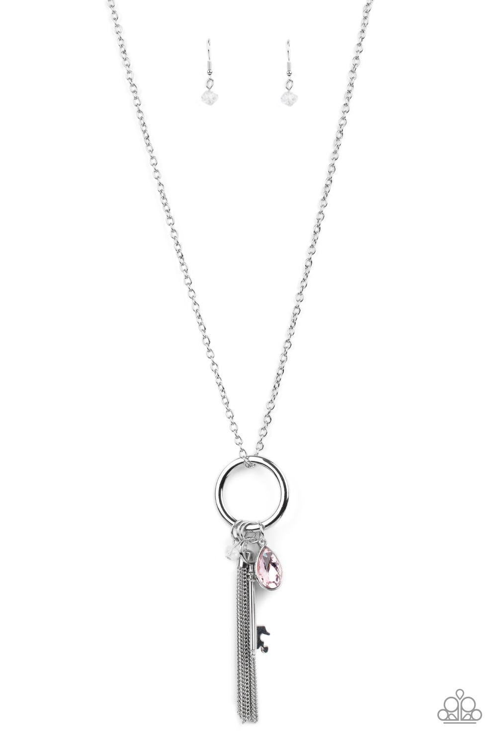A pink teardrop gem, silver key, dainty crystal-like bead, and shimmery silver chain tassel swing from the bottom of a silver ring at the bottom of a lengthened silver chain, creating a whimsically tasseled display. Features an adjustable clasp closure.
