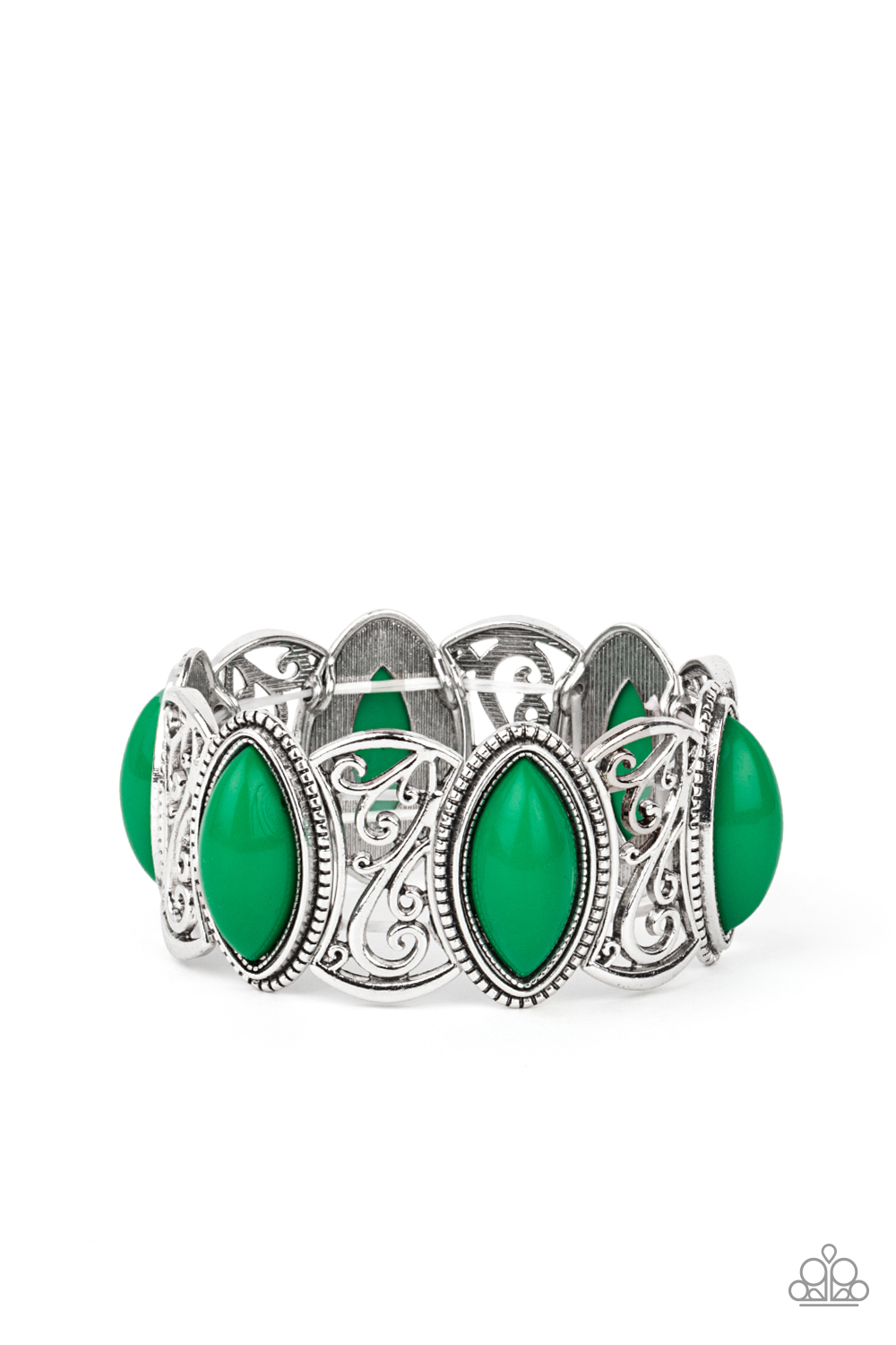 A whimsical collection of filigree filled silver frames and Mint beaded frames are threaded along stretchy bands around the wrist, creating a flamboyant pop of color.