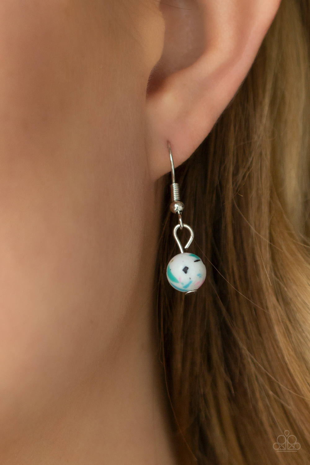 Featuring a terrazzo pattern, a speckled stone teardrop swings from the bottom of an ornately twisted silver chain for an earthy inspiration. Features an adjustable clasp closure.