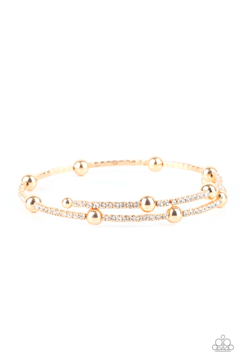 Dainty sections of glassy white rhinestones and glistening gold beads delicately coil around the wrist, creating a timeless shimmer.