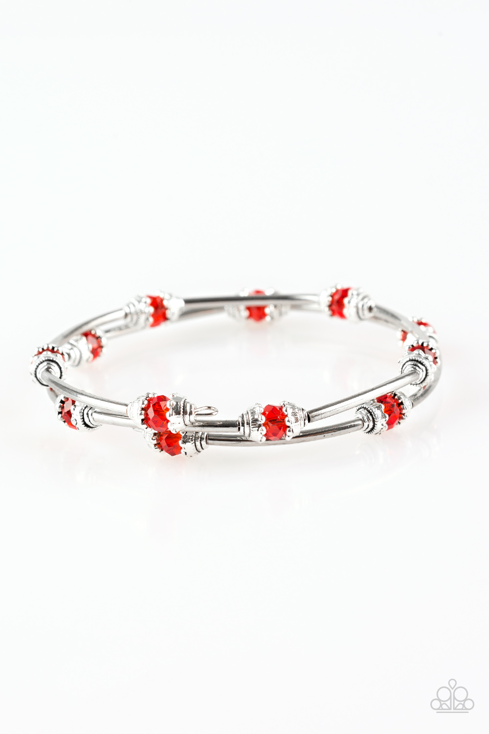 Dainty red crystal-like beads and shimmery silver accents alternate along a coiled wire to create a refined infinity wrap style bracelet.